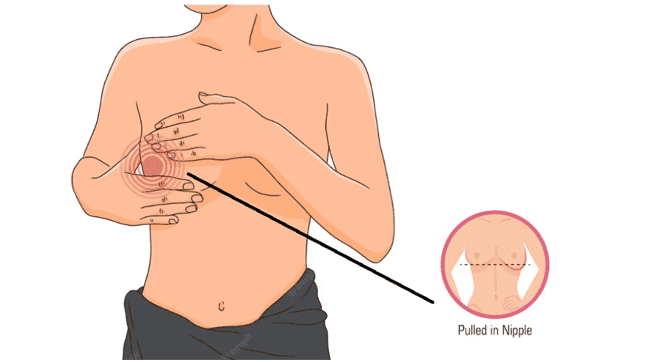 The symptoms of an inverted breast nipple due to an infection or cancer are as follows: